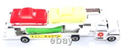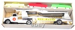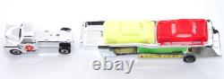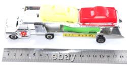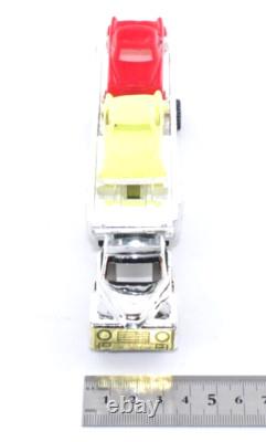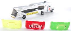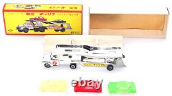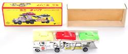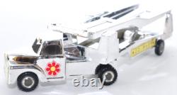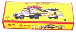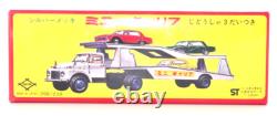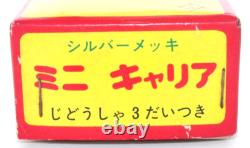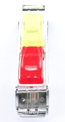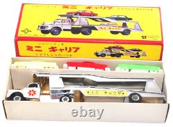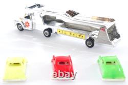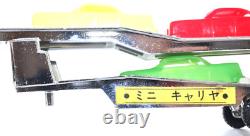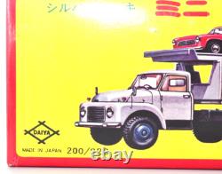 Extremely Rare Vintage 1960s Daiya (Terai Shoten) Mini Car Carrier with 3 Cars - Deadstock Japanese Tin-Style Plastic Toy - Silver Plated - No Motorized Function - Showa Era Collector's Item from Japan. Developed by Daiya (Terai Shoten), a Tokyo-based toy company specializing in affordable, lightweight plastic toys during Japan's high-growth postwar era. This mini car carrier was part of a lineup responding to increased domestic demand for Western-style vehicles and transportation toys in the 1960s. Silver plating was applied to enhance visual appeal while keeping production costs low, appealing to children and parents alike. Unlike Daiya's earlier tinplate toys, this product showcases the company's transition into safe, mass-producible plastic toys amid evolving safety standards.