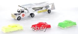 Manufactured without motorized parts to maintain simplicity, durability, and safety, making it suitable for younger age groups. True deadstock item from the 1960s, never used or played with-extremely rare in today's vintage toy market. Produced in limited quantities and rarely exported, making surviving examples scarce outside Japan.Most plastic toys from this era were discarded or damaged, making complete, undamaged sets with included cars very hard to find. Reflects a transitional phase in Japanese toy history-from metal to plastic manufacturing-making it historically significant for collectors. No modern reproductions exist, ensuring its authenticity and increasing collectible value. Vintage plastic mini car carrier toy made by Daiya (Terai Shoten) in Japan, circa 1960s.