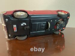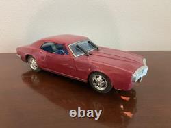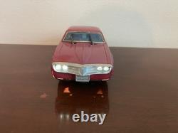 Vintage 1967 Pontiac Firebird battery-operated tin toy car, made in Japan. Classic red paint with detailed chrome trim, Firebird badge, and mid-century styling.