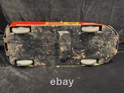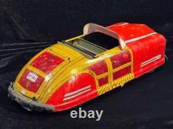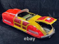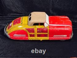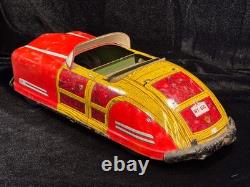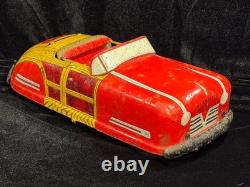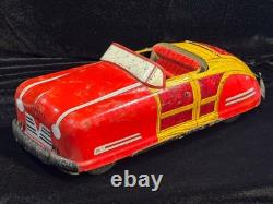 Fantastic vintage Wyandotte "Woody" convertible steel car, model WY-650. Made in the USA and bursting with 1940s-50s charm, this 12 red and yellow woodgrain beauty features lithographed side panels, curved rear fenders, and a faux soft-top design. A favorite among collectors for its eye-catching design and solid construction. Lithographed tin body with "woodie" panel styling.Rear trunk opens and closes (could be adjusted for smoother operation). Original paint and graphics with surface wear from age and play.